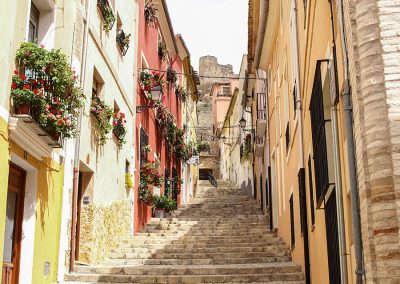 La historia de Biar está marcada por su ubicación fronteriza, lo que se refleja en su extenso patrimonio monumental. Pasear por sus calles empedradas, limpias y cuidadas es un verdadero placer. Estas calles conducen al imponente castillo, desde donde se puede admirar la estructura en forma de abanico del pueblo, sus tejados de color tierra y las encantadoras terrazas que adornan la parte alta de las casas del casco antiguo.